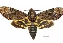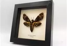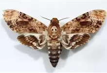 鬼脸天蛾,是鳞翅目天蛾科面形天蛾属动物。成虫翅展100~125毫米,体黑褐色;胸背有骷髅形斑纹;卵圆球形,直径约2毫米,淡黄绿色,表面光滑;老熟幼虫体长70~90毫米,蛹体长约56毫米;前翅为褐色,…全部>>