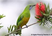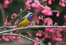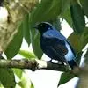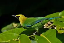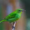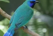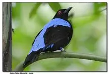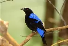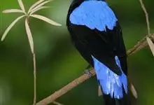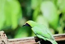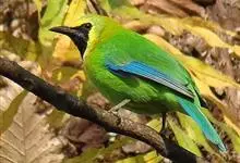 蓝翅叶鹎:小型鸟类,体长15-18厘米。雄鸟通体草绿色,尾蓝绿色,肩和翅亮蓝 色,胸缀有黄色,颏、喉黑色。雌鸟颏,喉蓝绿色。栖息在海拔1500米以下的常绿阔叶林、次生林和林缘疏林灌丛中。…全部>>