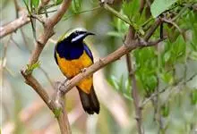 橙腹叶鹎体形大小和金额叶鹎相似,体长16~20厘米。额至后颈黄绿色,其余上体绿色,小覆羽亮钴蓝色,形成明显的肩斑。颏、喉、上胸黑色具钴蓝色髭纹,其余下体橙色。飞羽和尾羽雄鸟黑色、雌鸟绿色。…全部>>