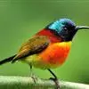 绿喉太阳鸟:共有9个亚种。小型鸟类,雄鸟体长13-15厘米、雌鸟10-12厘米。雄鸟前额至后颈、颏和喉辉绿色,头侧黑色,颈侧和背暗红色,两肩、下背橄榄绿色,腰鲜黄色,尾上覆羽和中央尾羽暗绿色,…全部>>