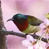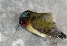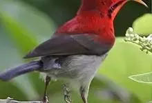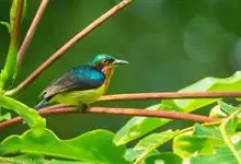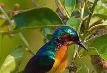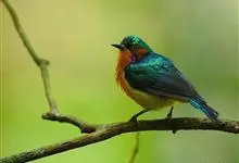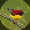 绿喉太阳鸟:共有9个亚种。小型鸟类,雄鸟体长13-15厘米、雌鸟10-12厘米。雄鸟前额至后颈、颏和喉辉绿色,头侧黑色,颈侧和背暗红色,两肩、下背橄榄绿色,腰鲜黄色,尾上覆羽和中央尾羽暗绿色,…全部>>