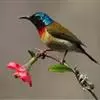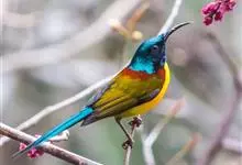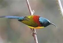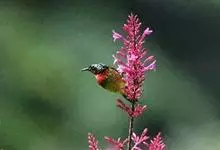 黑胸太阳鸟:小型鸟类,体长9-15厘米。嘴细长而向下曲。雄鸟中央尾羽特长,尾呈楔形,头顶至后颈紫蓝色具金属光泽;背褐红色,腰有一黄色横带,尾上覆羽和尾紫蓝色;颏、喉和上胸乌黑色,有的下胸为硫黄色,…全部>>