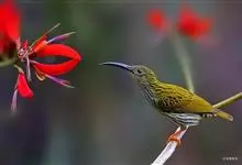 纹背捕蛛鸟:为太阳鸟科捕蛛鸟属的鸟类。是太阳鸟科中体型较大的一种,体重25-45克,体长160-210毫米。嘴粗长而尖且向下弯曲。上体橄榄黄色具黑色中央斑纹。下体淡黄白色满布黑色纵纹,尾具黑色次端斑。…全部>>