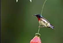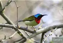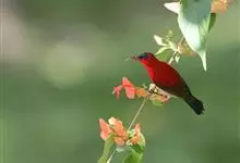 叉尾太阳鸟,雀形目太阳鸟科太阳鸟属留鸟;为小型鸟类,雄鸟头顶辉蓝绿色,上体橄榄绿色,腰明黄色,中央尾羽亮翠蓝色,羽轴针状延长,外侧尾羽黑色具白色端斑,头侧黑色,颜、喉和胸为绛红色,…全部>>