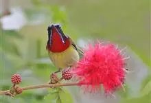 黄腰太阳鸟共有16个亚种,小型鸟类,体长10-15厘米。嘴细长而向下弯曲,雄鸟额和头顶前部金属绿色,头顶后部橄榄褐色。其余头、颈、背、肩、颏、喉、胸以及翅上中覆羽和小覆羽概为红色,腰黄色,…全部>>