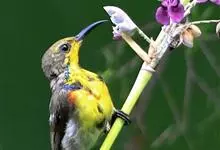 黄腹花蜜鸟是雀形目太阳鸟科花蜜鸟属鸟类。体型较小、喙略短而弯、腹部黄色。雄鸟繁殖季节颏及胸黑紫色并泛金属光泽,具有绯红色及灰色胸带,将上腹部黑色斑与前胸隔开,肩斑为橙黄色丝质羽,上体橄榄绿色,…全部>>