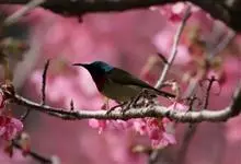 黑胸太阳鸟:小型鸟类,体长9-15厘米。嘴细长而向下曲。雄鸟中央尾羽特长,尾呈楔形,头顶至后颈紫蓝色具金属光泽;背褐红色,腰有一黄色横带,尾上覆羽和尾紫蓝色;颏、喉和上胸乌黑色,有的下胸为硫黄色,…全部>>