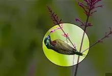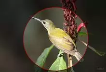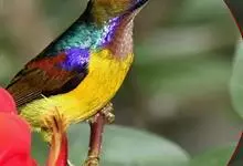 绿喉太阳鸟:共有9个亚种。小型鸟类,雄鸟体长13-15厘米、雌鸟10-12厘米。雄鸟前额至后颈、颏和喉辉绿色,头侧黑色,颈侧和背暗红色,两肩、下背橄榄绿色,腰鲜黄色,尾上覆羽和中央尾羽暗绿色,…全部>>