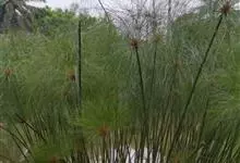 纸莎草是莎草科、莎草属的植物,具有粗壮的根状茎,高达2-3米,茎秆簇生,粗壮,直立,钝三棱形。叶退化呈鞘状,茎秆顶端着生总苞片,呈伞状簇生,总苞片叶状,披针形,顶生花序伞梗极多,细长下垂。瘦果灰褐色,…全部>>