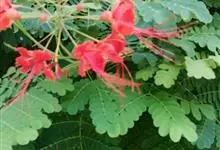 洋金凤 Sw.),豆科小凤花属灌木状或小乔木植物,枝无毛,绿或粉绿色;二回羽状复叶;总状花序伞房状,萼片无毛,花瓣橙红或黄色,圆形,花丝红色,子房无毛,花柱橙黄色;荚果窄而薄,…全部>>