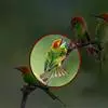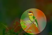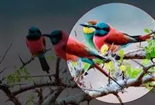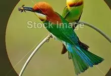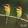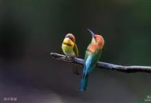 栗喉蜂虎是蜂虎科蜂虎属的鸟类。有热带鸟类羽毛艳丽的特征:喉部是栗红色的,黑色的过眼纹,翅膀和背部是绿色的,尾翼是蓝色的,飞行时翅膀下面的羽毛是橙黄色的,在阳光的照射下,它们全身闪烁着金属般的艳丽光泽,…全部>>