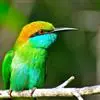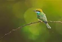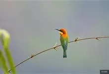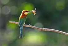 绿喉蜂虎是佛法僧目、蜂虎科的小型鸟类,共有9个亚种。身长22-25厘米,翼展29-30厘米,体重15-20克。喉绿色,额部、头顶至上背为锈红色,其余上体均为亮绿色。中央尾羽延长且端段狭细,…全部>>
