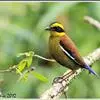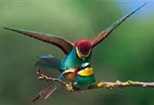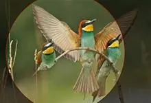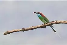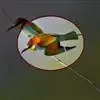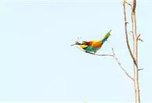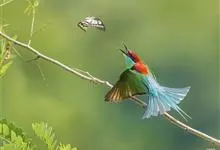 栗喉蜂虎是蜂虎科蜂虎属的鸟类。有热带鸟类羽毛艳丽的特征:喉部是栗红色的,黑色的过眼纹,翅膀和背部是绿色的,尾翼是蓝色的,飞行时翅膀下面的羽毛是橙黄色的,在阳光的照射下,它们全身闪烁着金属般的艳丽光泽,…全部>>