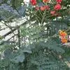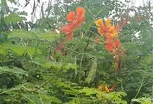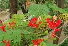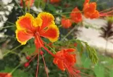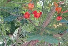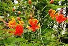 洋金凤 Sw.),豆科小凤花属灌木状或小乔木植物,枝无毛,绿或粉绿色;二回羽状复叶;总状花序伞房状,萼片无毛,花瓣橙红或黄色,圆形,花丝红色,子房无毛,花柱橙黄色;荚果窄而薄,…全部>>