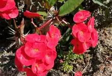 虎刺梅:别称铁海棠,是蔓生灌木植物。茎多分枝,长60-100厘米,直径5-10毫米,具纵棱,密生硬而尖的锥状刺,刺长1-1.5厘米,直径0.5-1.0 毫米,常呈3-5列排列于棱脊上,呈旋转。叶互生…全部>>