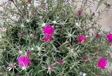 大花马齿苋:一年生草本,高10-30厘米。茎平卧或斜升,紫红色,多分枝,节上丛生毛。叶密集枝端,较下的叶不规则互生,叶片细圆柱形,无毛。花单生或数朵簇生枝端,直径2.5-4厘米,…全部>>