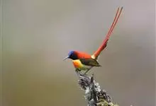火尾太阳鸟为太阳鸟科太阳鸟属的鸟类。体长20厘米,色彩艳丽。雄鸟红色,具形长的艳猩红色中央尾羽。头顶金属蓝色,眼先和头侧黑色,喉及髭纹金属紫色。下体黄色,胸具艳丽的橘黄色块斑。雌鸟灰橄榄色,腰黄,…全部>>