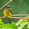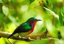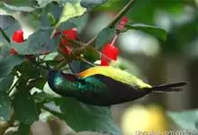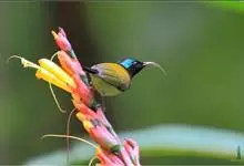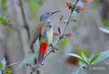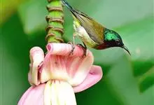 绿喉太阳鸟:共有9个亚种。小型鸟类,雄鸟体长13-15厘米、雌鸟10-12厘米。雄鸟前额至后颈、颏和喉辉绿色,头侧黑色,颈侧和背暗红色,两肩、下背橄榄绿色,腰鲜黄色,尾上覆羽和中央尾羽暗绿色,…全部>>