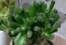筒叶花月,是景天科青锁龙属的多年生草本植物。植株多分株,灌木状,茎较粗壮,圆柱形,表皮灰褐色;叶片肉质,互生,呈圆筒状,簇生于茎或分枝顶端,叶端呈斜截形,截面为椭圆形;花呈星状,淡白色;花期秋季。…全部>>