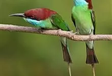 绿喉蜂虎是佛法僧目、蜂虎科的小型鸟类,共有9个亚种。身长22-25厘米,翼展29-30厘米,体重15-20克。喉绿色,额部、头顶至上背为锈红色,其余上体均为亮绿色。中央尾羽延长且端段狭细,…全部>>