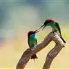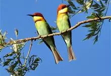 栗喉蜂虎是蜂虎科蜂虎属的鸟类。有热带鸟类羽毛艳丽的特征:喉部是栗红色的,黑色的过眼纹,翅膀和背部是绿色的,尾翼是蓝色的,飞行时翅膀下面的羽毛是橙黄色的,在阳光的照射下,它们全身闪烁着金属般的艳丽光泽,…全部>>