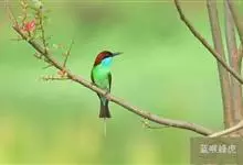 栗喉蜂虎是蜂虎科蜂虎属的鸟类。有热带鸟类羽毛艳丽的特征:喉部是栗红色的,黑色的过眼纹,翅膀和背部是绿色的,尾翼是蓝色的,飞行时翅膀下面的羽毛是橙黄色的,在阳光的照射下,它们全身闪烁着金属般的艳丽光泽,…全部>>