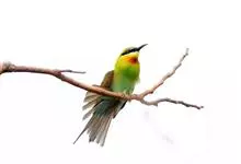 黄喉蜂虎属中型鸟类,体长23-30厘米。喉黄色,其下有一窄的黑色胸带;胸带以下的整个下体蓝绿色。前额蓝白色,具一宽的黑色贯眼纹,头顶至后颈暗栗色,尾蓝绿色,中央尾羽延长,明显突出于其他尾羽。…全部>>