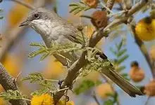 白喉林莺:体长10-13厘米,是一种类体型略小的莺鸟。喉白,上体灰褐或沙褐色,头顶较灰,贯眼纹黑褐或暗褐色。下体污白。耳羽深黑灰,胸侧及两胁沾皮黄色、褐色或淡粉红色。外侧尾羽羽缘白色。…全部>>