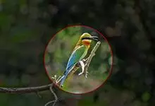 蓝喉蜂是蜂虎科蜂虎属鸟类。体长26-28厘米,嘴长而弯曲,有明显细长的中央尾羽。头部、颈部和背部为巧克力色,有黑色眼纹。喉部、腰部和尾羽为蓝色。腹部和两翼为绿色。幼鸟外观似成鸟,头部、颈部和背部为绿色,…全部>>