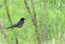 发冠卷尾是中型鸟类,体长28-35厘米。通体绒黑色缀蓝绿色金属光泽,额部具发丝状羽冠,外侧尾羽末端向上卷曲。栖息于海拔1500米以下的低山丘陵和山脚沟谷地带,多在常绿阔叶林、次生林或人工松林中活动。…全部>>