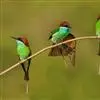 栗喉蜂虎是蜂虎科蜂虎属的鸟类。有热带鸟类羽毛艳丽的特征:喉部是栗红色的,黑色的过眼纹,翅膀和背部是绿色的,尾翼是蓝色的,飞行时翅膀下面的羽毛是橙黄色的,在阳光的照射下,它们全身闪烁着金属般的艳丽光泽,…全部>>