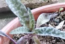 油点百合属于百合科的多年生草本植物,别称是豹纹红宝。原产于南非。株高约10-15公分,紫红色的茎肥大呈酒瓶状,茎顶着生3-5片肉质叶子,叶银绿色并具有不规则的斑点,叶背紫红色。花期春夏季,圆锥花序,…全部>>