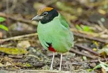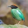 绿胸八色鸫:是雀形目八色鸫科的鸟类,共有12个亚种。体长为16-18厘米,体重65-69克。体型圆胖,尾短,腿长。头黑,上体绿色,两翼深色而具白色斑纹,头顶至后枕深褐,胸及腹部苹果绿,臀亮红。…全部>>