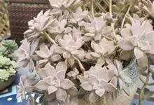 胧月 E.Walther)是景天科,风车草属多肉植物,常绿蔓生亚灌木,叶肥厚无柄,灰蓝色,阳光充足时呈粉红色,叶片枝顶簇生成莲座状,乳白色,花冠5裂,上有紫红色斑点,雄蕊两轮排列,花药鲜红色,…全部>>