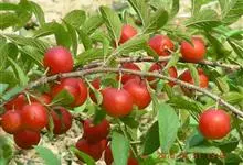 欧李,蔷薇科李属落叶灌木植物,高1.5米。树皮灰褐色,小枝被柔毛;叶互生长圆形或椭圆状披针形;花与叶同时开放,单生或并生,花瓣白色或粉红色;核果近球形,熟时鲜红色或橘黄色。花期4-5月,果期5-6月。…全部>>