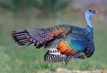 眼斑吐绶鸡:是火鸡科的两种鸟类之一。体型比普通火鸡略小些,体长1米左右,体重2.4-5.4千克,雄性比雌性略大,长得很特别,蓝色的秃脑袋上冒出几个橙黄色的疙瘩。但是它羽色艳丽,身体呈铜色及绿色。…全部>>