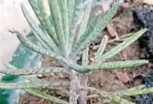 棒叶落地生根是景天科、落地生根属植物。茎直立、粉褐色。叶圆棒形,上表面有沟、粉色,有红褐斑。叶片交互对生,交叉排列成十字形。叶端锯齿上长有很小的幼株、落地后即可生根成活。原产非洲马达加斯加。…全部>>