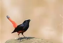 红头咬鹃: 体大,体长约33厘米,体重75-110克。头、颈暗绯红色;背、肩锈褐色。两翅黑色,翅上覆羽和内侧飞羽密被白色细虫蠹斑纹,初级飞羽黑色,外侧具白色羽缘;腰和尾上覆羽较多锈色。中央尾羽深栗色,…全部>>