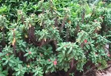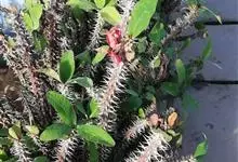 虎刺梅:别称铁海棠,是蔓生灌木植物。茎多分枝,长60-100厘米,直径5-10毫米,具纵棱,密生硬而尖的锥状刺,刺长1-1.5厘米,直径0.5-1.0 毫米,常呈3-5列排列于棱脊上,呈旋转。叶互生…全部>>