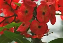 铁海棠为大戟科大戟属蔓生灌木植物;茎多分枝,具纵棱,呈旋转状;叶互生,通常集中于嫩枝上;每个花序基部边缘具微小的红色尖头;苞叶先端圆且具小尖头,无柄,上面鲜红色,下面淡红色;苞片丝状;子房光滑无毛,…全部>>