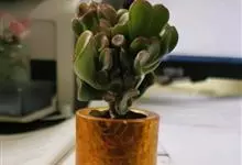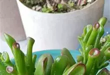 筒叶花月,是景天科青锁龙属的多年生草本植物。植株多分株,灌木状,茎较粗壮,圆柱形,表皮灰褐色;叶片肉质,互生,呈圆筒状,簇生于茎或分枝顶端,叶端呈斜截形,截面为椭圆形;花呈星状,淡白色;花期秋季。…全部>>