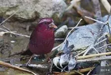 酒红朱雀小型鸟类,体长13~15厘米。雄鸟通体深红色,头部深朱红或棕红色,下背和腰玫瑰红色,眉纹粉红色而具丝绢光泽。两翅和尾黑褐或灰褐色、具暗红色狭缘,内侧两枚三级飞羽具淡粉红色先端。…全部>>