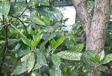 洒金桃叶珊瑚,常绿灌木,原产中国台湾及日本,属于藤本类。 不甚耐寒。小枝粗圆。叶对生,叶片椭圆状卵圆形至长椭圆形,油绿,光泽,散生大小不等的黄色或淡黄色的斑点,先端尖,边缘疏生锯齿。属桃叶珊瑚属、…全部>>