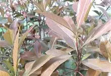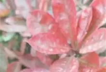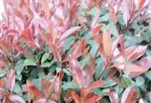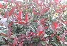 红叶石楠 是蔷薇科,石楠属杂交种,为常绿小乔木或灌木,乔木高可达5米、灌木高可达2米。叶片革质,长圆形至倒卵状、披针形,叶端渐尖,叶基楔形,叶缘有带腺的锯齿,花多而密,复伞房花序,花白色,梨果黄红色,…全部>>