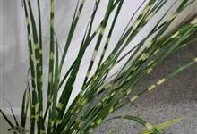 斑叶芒是禾本科、芒属多年生草本植物。丛生状,茎高可达1.7米。叶片有黄色不规则斑纹,非常亮丽下面疏生柔毛并被白粉,具黄白色环状斑。圆锥花序扇形,小穗成对着生,两性花,花黄色,花序紫红色。…全部>>
