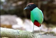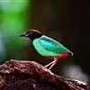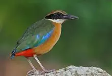 绿胸八色鸫:是雀形目八色鸫科的鸟类,共有12个亚种。体长为16-18厘米,体重65-69克。体型圆胖,尾短,腿长。头黑,上体绿色,两翼深色而具白色斑纹,头顶至后枕深褐,胸及腹部苹果绿,臀亮红。…全部>>