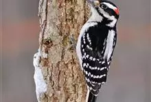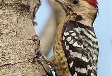 小斑啄木鸟,是啄木鸟科、啄木鸟属的小型鸟类,体长14-18厘米。额和颊白色,头顶雄鸟红色,雌鸟黑色。后颈至上背黑色,下背白色而具黑色横斑。两翅黑色具白色横斑。尾黑色,外侧尾羽具白色横斑。下体灰白色,…全部>>