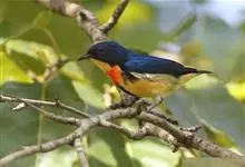 红胸啄花鸟:体重5-10克,体长60-92毫米。体形纤小。雄鸟上体呈辉亮的金属绿色;下体棕黄,胸部具一朱红色块斑,极易与其他啄花鸟区别。雌鸟上体呈橄榄绿,下体棕黄色。虹膜褐色,嘴褐黑色或角灰色,…全部>>