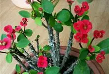 铁海棠为大戟科大戟属蔓生灌木植物;茎多分枝,具纵棱,呈旋转状;叶互生,通常集中于嫩枝上;每个花序基部边缘具微小的红色尖头;苞叶先端圆且具小尖头,无柄,上面鲜红色,下面淡红色;苞片丝状;子房光滑无毛,…全部>>