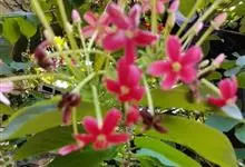 使君子 Jongkind)是使君子科、使君子属攀援灌木,叶对生,椭圆形,两面均被灰白色柔毛。穗状花序,倒挂下垂。花期夏秋。果有五棱,熟时黑色,种子白色。分布于印度、缅甸、菲律宾和中国。喜温润,深根性,…全部>>